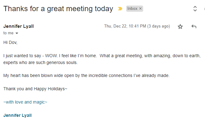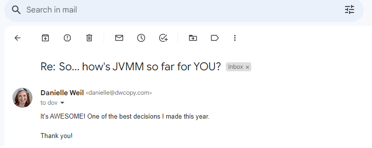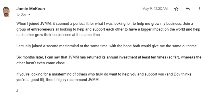 "Dov, I just wanted to let you know how impressed I am with the members in JVGrow.co. I just joined a month ago and have already interacted and individually met with about 20 members and I must say I find them all to be high-level individuals who are looking to help others, not just "pitch an offer." As a matter of fact, not one person has pitched me anything so far besides "how can I help you, Jim?" Really solid group of business owners here who are A-level players. I am impressed so far and I know long term relationships and future ROI will come from it."